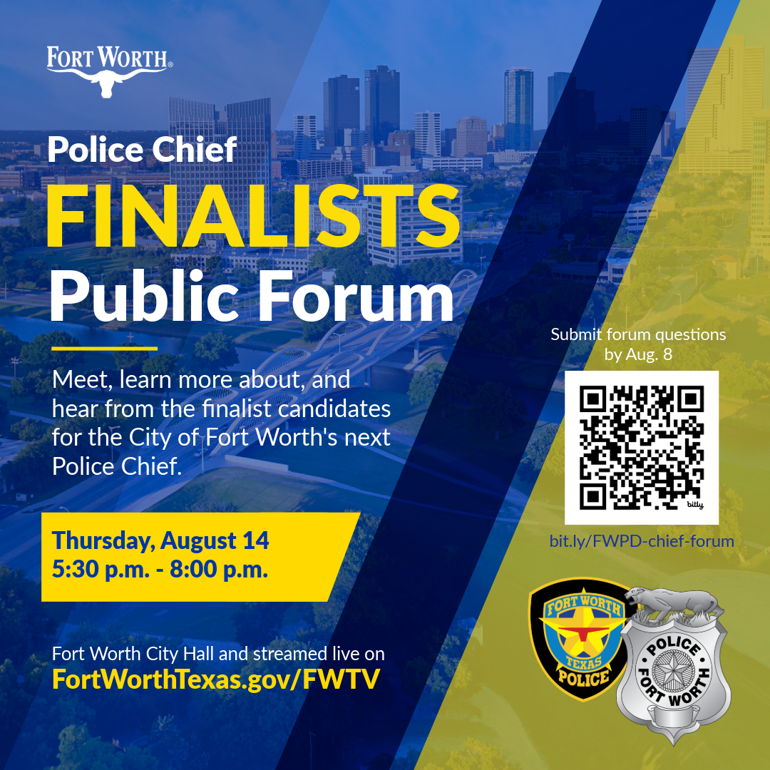 The City of Fort Worth will hold a meet- and-greet community forum on Thursday, August 14th at 5:30 p.m. hosted at City Hall (100 Fort Worth Trail). The event will also be streamed live online and on Fort Worth Television (FWTV). Community members are welcome to submit their questions for the candidates online by Friday, August 8th.
