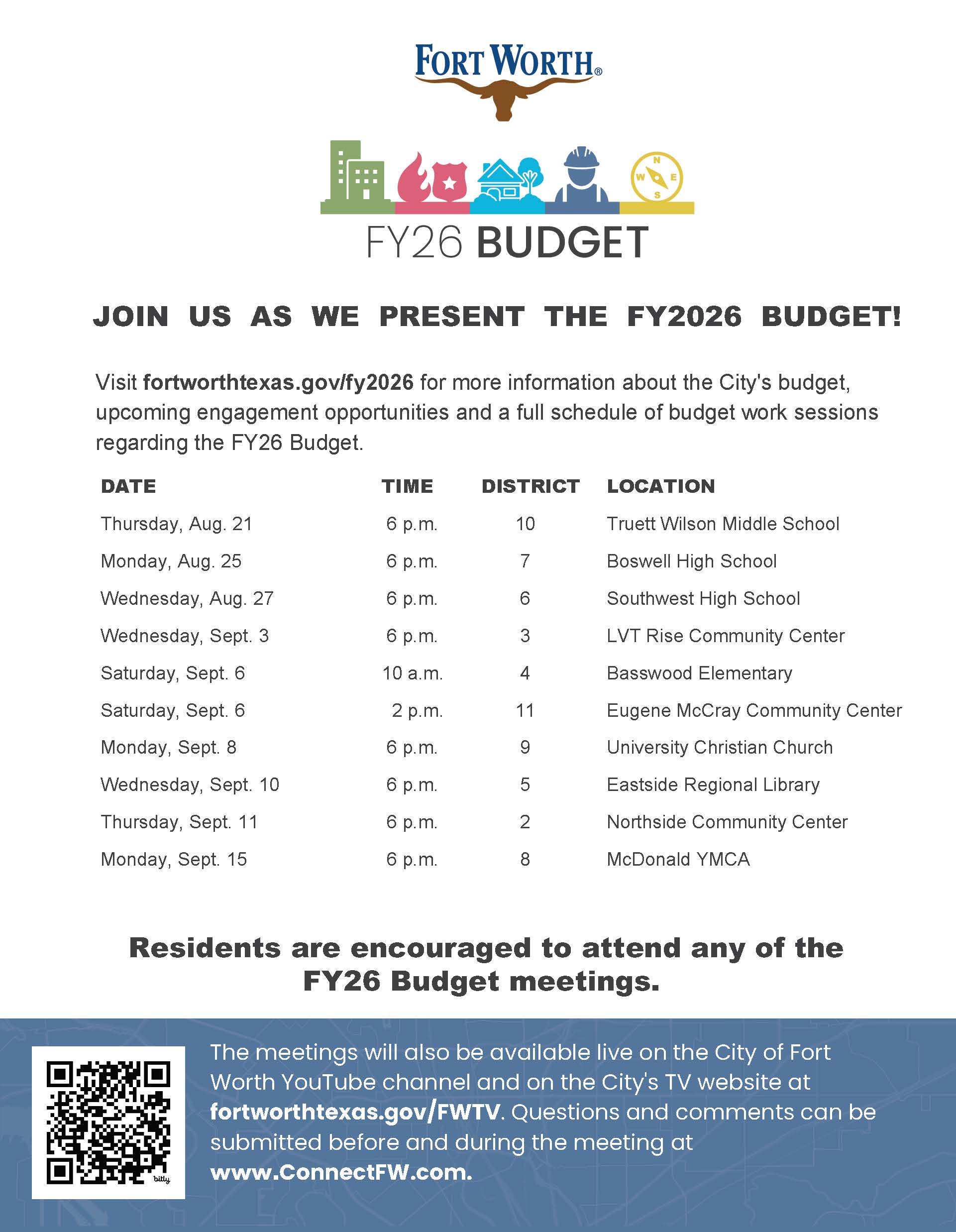The meetings will also be livestreamed on YouTube and the city’s TV stream. Questions and comments about the budget can be submitted through an online portal. FY2026 Budget | Fort Worth