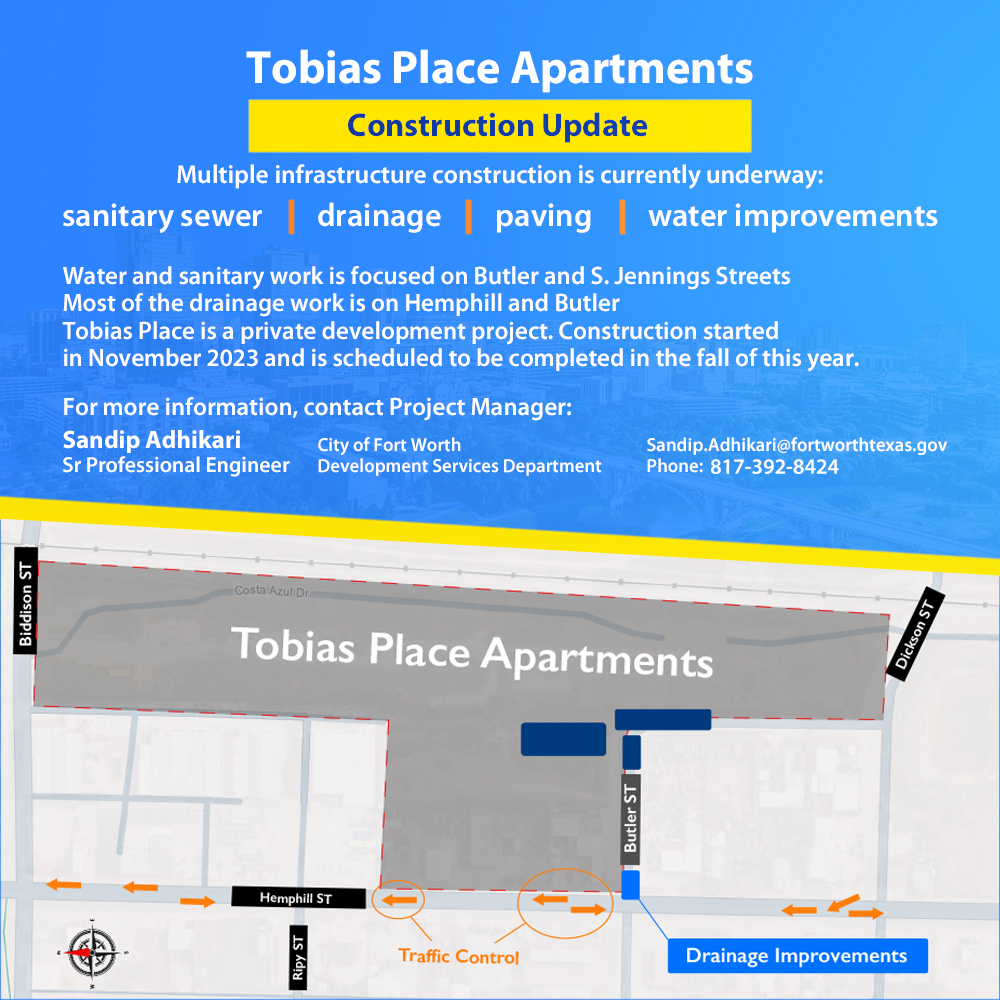 - Drainage: Most of the drainage work is taking place on Hemphill and Butler.