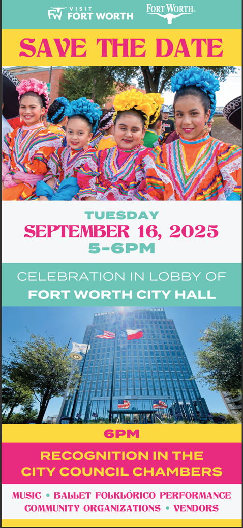 El 16 de septiembre, de 5 a 6 de la tarde, la ciudad de Fort Worth, en colaboración con Visita Fort Worth, celebrará el Mes de la Herencia Hispana con un evento lleno de diversión en el Ayuntamiento. Los residentes están invitados a unirse a nosotros para disfrutar de reconocimientos especiales, música y platillos tradicionales, puestos de venta y actuaciones de grupos de danza del Ballet Folklórico. Les animo a que se unan a nosotros en este evento para que podamos compartir nuestra cultura y tradiciones con ustedes.