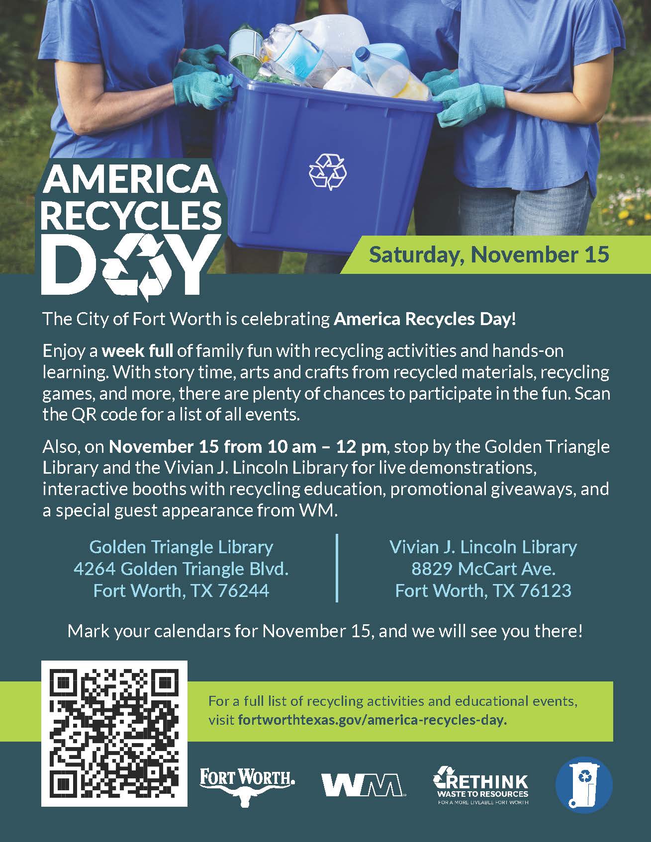 The Environmental Services and Fort Worth Public Library Departments are partnering to create a fun-filled learning event for America Recycles Day.