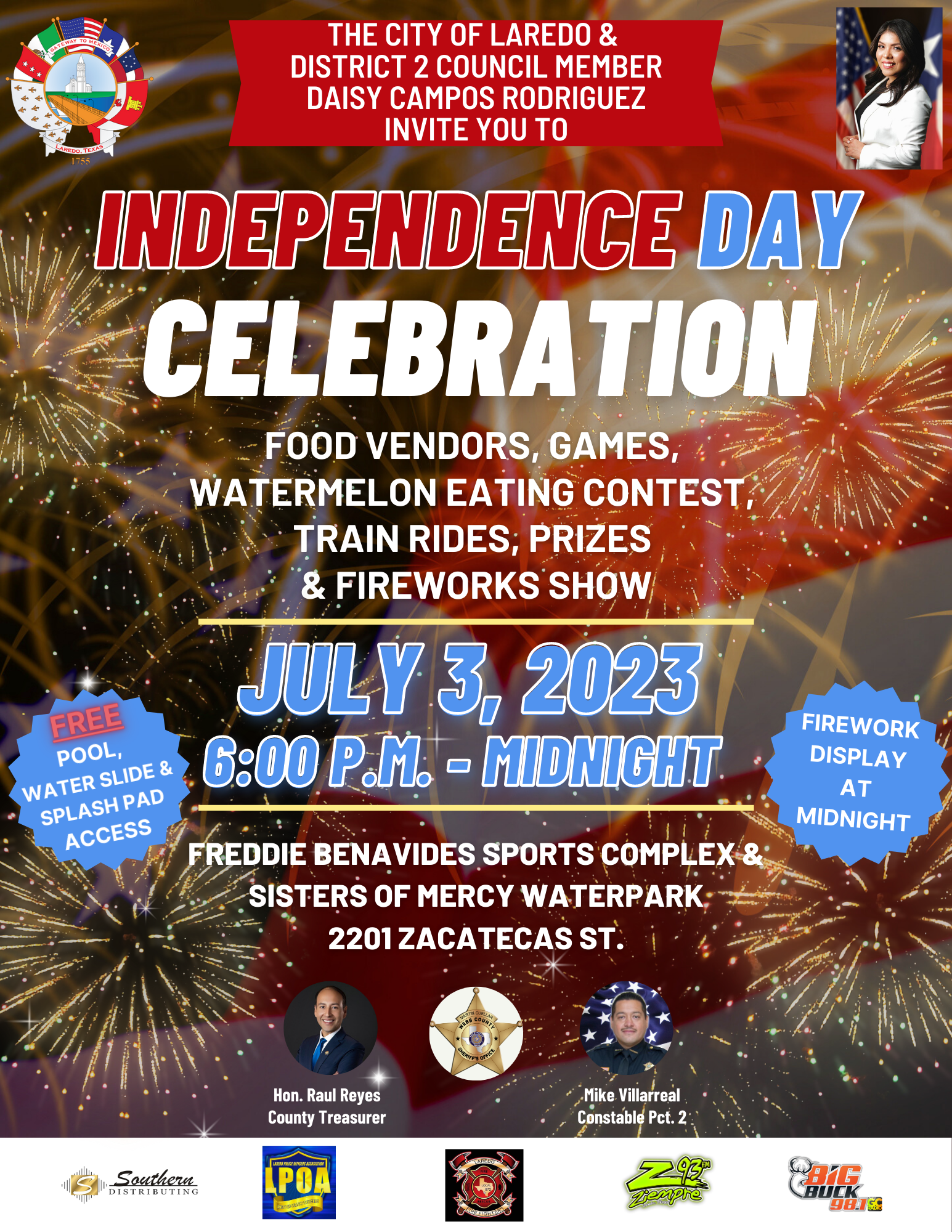 District 2 Council Member, Daisy Campos Rodriguez invites the community to an Independence Day Celebration. Monday, July 3, 2023 from 6:00 PM to midnight, at the Freddie Benavides & Sisters of Mercy Waterpark, 2201 Zacatecas St. Food vendors, watermelon eating contest, train rides, and much more! Fireworks display at midnight.