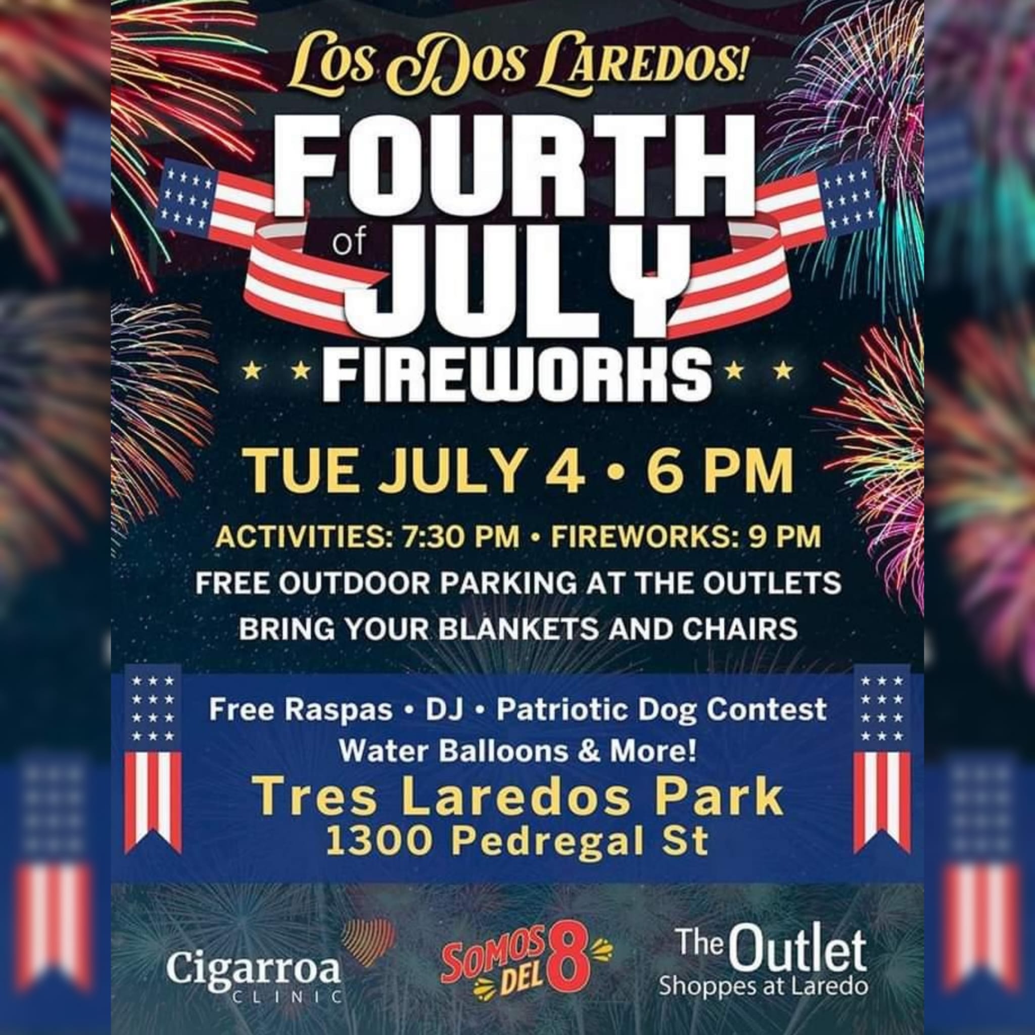 Los Dos Laredos Fourth of July Fireworks! Join the fun on Tuesday, July 4, 2023, at 6:00 PM, at Tres Laredos Park, 1300 Pedregal St. Free raspas, DJ, Patriotic Dog Contest, water balloons, and much more! Activities will begin at 7:30 PM and there will be a fireworks display at 9:00 PM.