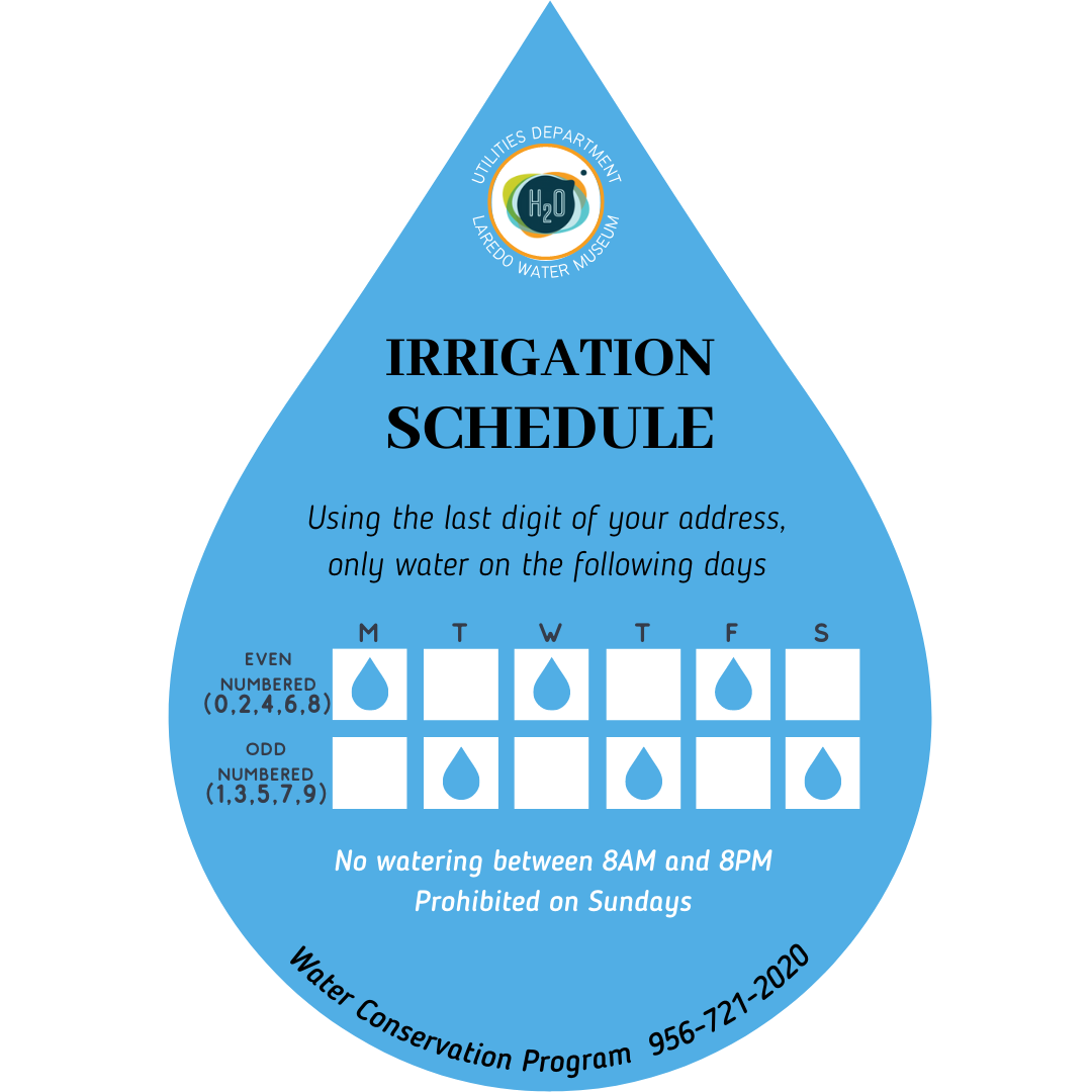 As the City of Laredo prepares to enter Stage 2 on the Drought Contingency Plan, the Utilities Department asks the community to adjust the irrigation schedules effective immediately.