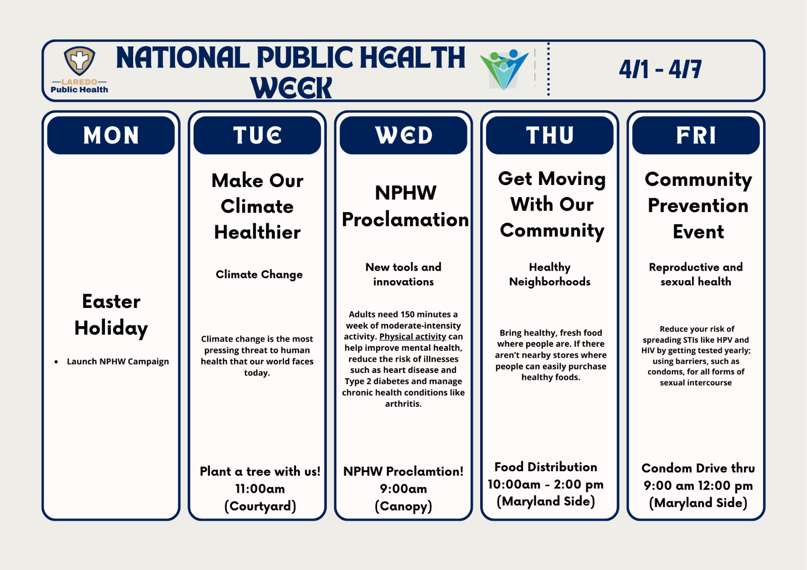 National Public Health Week Proclamation Date/Time: Wednesday, April 3, 2024, at 9:00 AM Location: Laredo Public Health Department, 2600 Cedar Ave., Laredo, Texas 78040 |