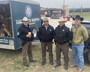 L to R: Medina County Game Warden, Jorge Tamayo, and Bexar County Game Wardens, Roland Fuentes and Captain David Nieto, along with former Mobile Shooting Sports Coordinator, Morgan Harbison, joined the festivities at the San Antonio Rodeo 2025 Junior Shoot-Out. The wardens brought their "Violations" trailer and Harbison, who is going through the TPWD Park Police Training Academy, joined the WHIZ Bang committee meeting to help with the future of TPWD's mobile shotgun shooting program. a BIG THANKS for coming and greeting the hundreds of kids and their families and promoting the shooting sports in a big way!