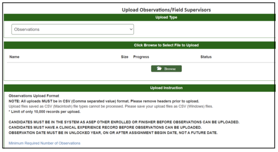 A: The observation types are found in your Green Screen by navigating to ASEP>Upload Observations>Select Upload Type>Observations to find the link to “Minimum Required Number of Observations”. That link in your Green Screen takes you to the EPP Reporting Definitions page that contains Form A and Form B options. Form B contains the required observations for candidates who fall under legacy 19 TAC §228.35(g) & (h) and Form A contains the required observations for candidates who began the clinical experience on 9/1/2024 or after. Both forms reference the required number of observations with the associated TAC per assignment for each type of clinical experience. This is what your Green Screen will look like when you have navigated to the Observations page: