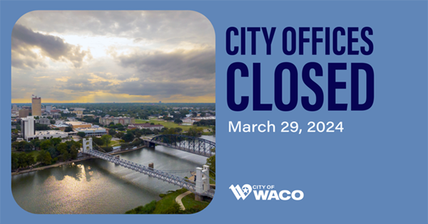 City of Waco offices will be closed on Friday, March 29. Residents with a Friday trash collection day will have their gray waste carts and green yard waste carts collected earlier on Wednesday, March 27.