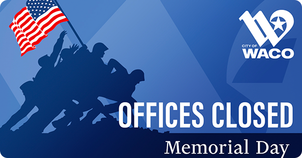 In observance of the Memorial Day holiday, City of Waco offices are closed. Residents with a Monday trash collection day will have their gray waste carts and blue recycling carts collected later on Wednesday, May 29. For more information about other City of Waco departments, read the full article.