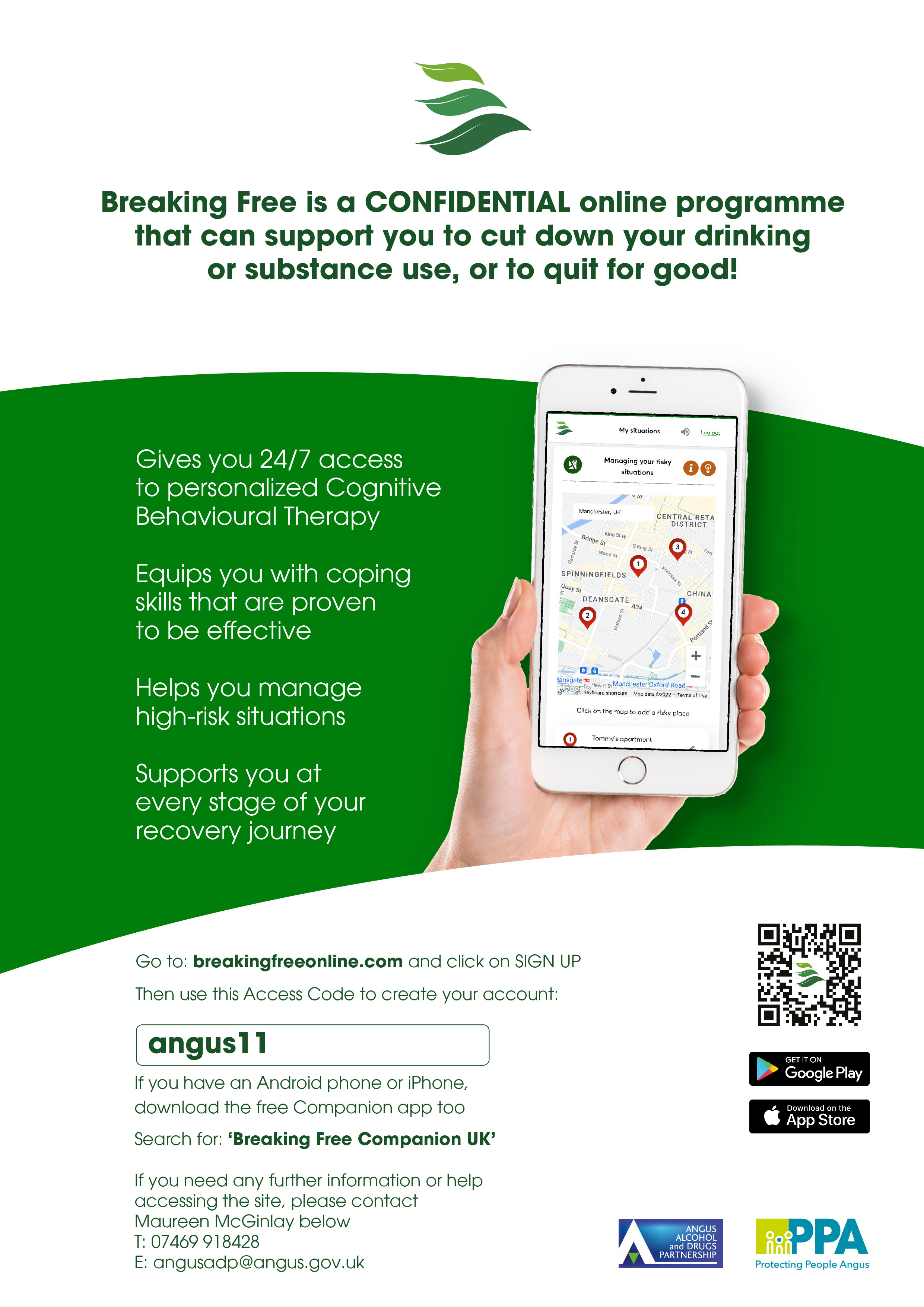 I don't want to be the one to mention Christmas, but I will. The festive period is approaching fast, and we know it's a time when people consume more alcohol than usual. We know since Covid, we have seen a rise in health issues through alcohol. In Angus, we have a CONFIDENTIAL app to help reduce any substances. You can use it yourself or support a family member, friend, or someone you work with to use the Breaking Free Online resource. It can be used for any substance, not just alcohol, and can be accessed at any time, day or night. Anyone can sign up to use the app in Angus. We are also offering training for anyone who wants to learn more about the app, and dates will follow shortly.