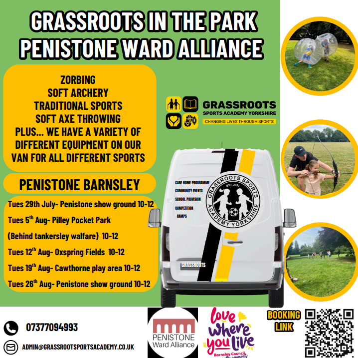 The Grassroots Sports Van will be out in the Penistone Area over the summer holidays. Take part in lots of fun activities, like zorbing, soft archery, soft axe throwing and more. To find out more or book, click the button below or email admin@grassrootsportsacademy.co.uk.