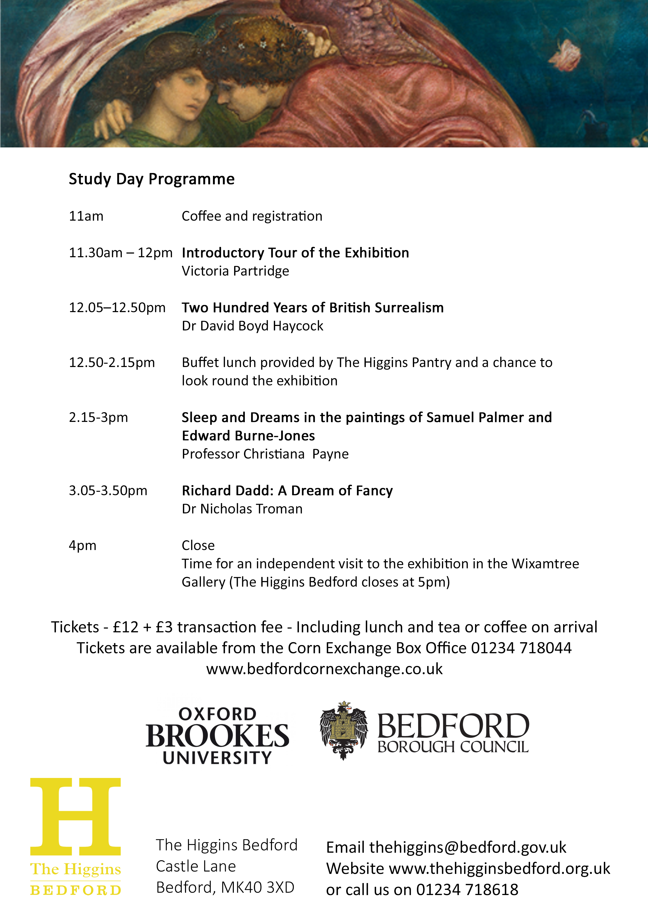 Enjoy a tour of the Dreams and Nightmares exhibition as well as several talks focusing on British Surrealism and the artists Richard Dadd, Samuel Palmer and Edward Burne-Jones. Includes lunch provided by The Higgins Pantry.