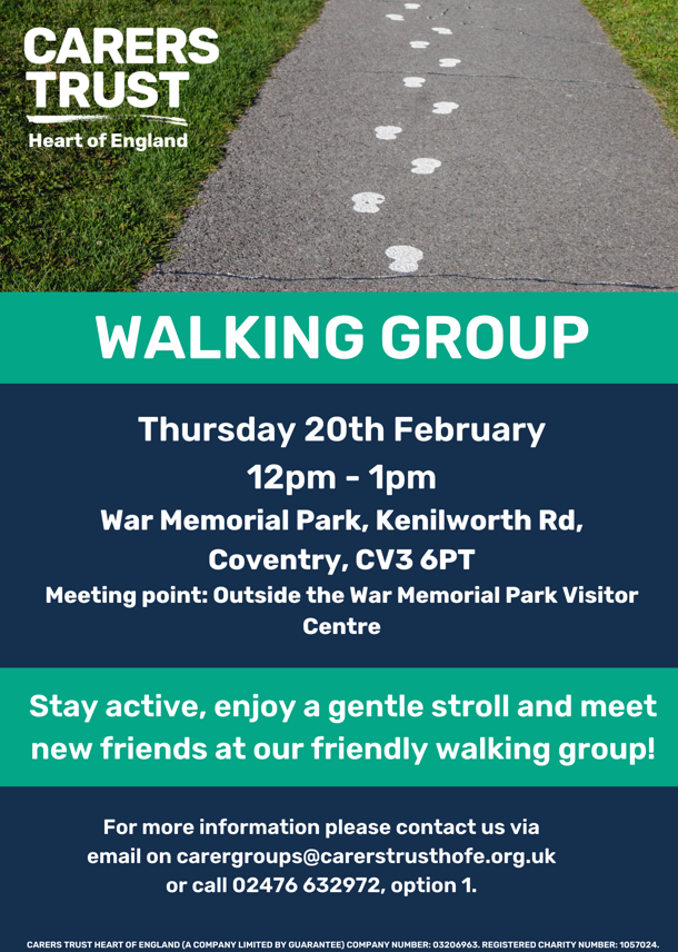 Carers' Trust Heart of England are inviting you to attend their walking group being held on Thursday 20 February from 12noon - 1pm at War Memorial Walk, Kenilworth Road, Coventry CV3 6PT. Meeting Point: Outside the War Memorial Park Visitor Centre.
