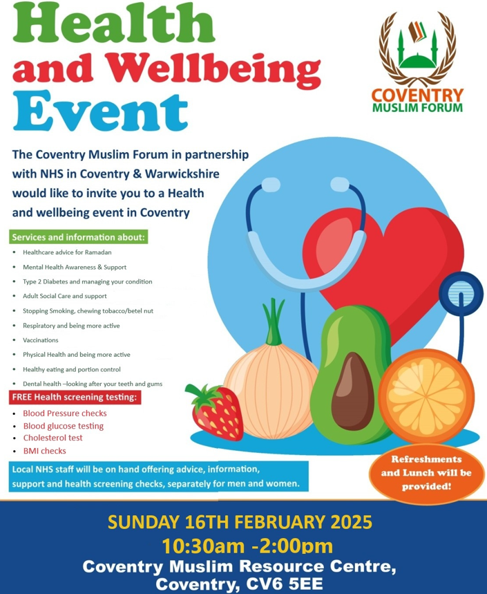 Coventry Muslim Forum in partnership with NHS in Coventry and Warwickshire would like to invite you to a health and wellbeing event in Coventry.