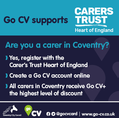 All you need to do is register with the Carers Trust Heart of England who will provide you with a letter to confirm you are a carer then ensure your Go CV account is upgraded with your status to get Go CV+ level of discount, the highest level of discounts for residents. You can then easily upload a copy of your carer’s letter. More information can be found on the Go CV website.