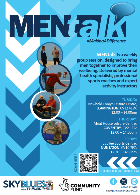 MENtalk supports individuals struggling with their mental health and wellbeing. The sessions are aimed at people aged 18+ and supports them regardless of the severity of their mental health problems. The session offers a warm, open environment for individuals to take part in activities (such as football, basketball, badminton, table tennis etc) and receive targeted mental health support as and when it is necessary.