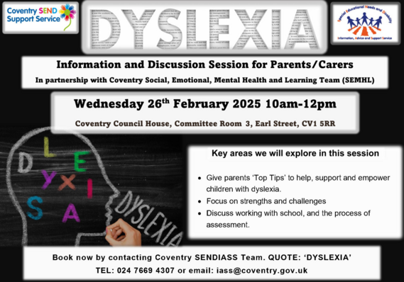 In partnership with Coventry Social, Emotional, Mental Health and Learning Team (SEMHL), SENDIASS are offering a FREE "Dyslexia: Information and Discussion session for Parents/Carers".