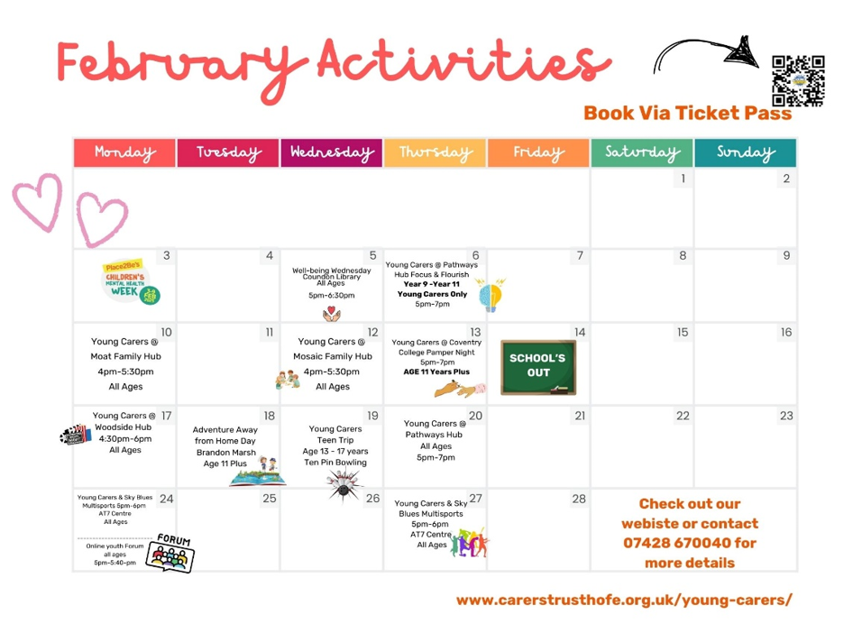 There is a whole range of activities and events taking place across February so it's looking like a busy month with lots on offer. These include a Health and Wellbeing event at the Coventry Muslim Resource Centre, to a book club and specific support around Dementia as well as caring for someone with a life long illness.