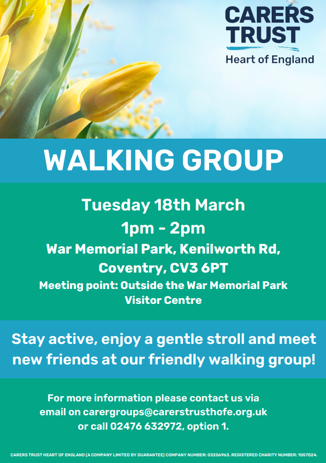 Carers' Trust Heart of England are inviting you to attend their walking group being held on Tuesday 18 March from 1pm - 2pm at War Memorial Walk, Kenilworth Road, Coventry CV3 6PT. Meeting Point: Outside the War Memorial Park Visitor Centre.