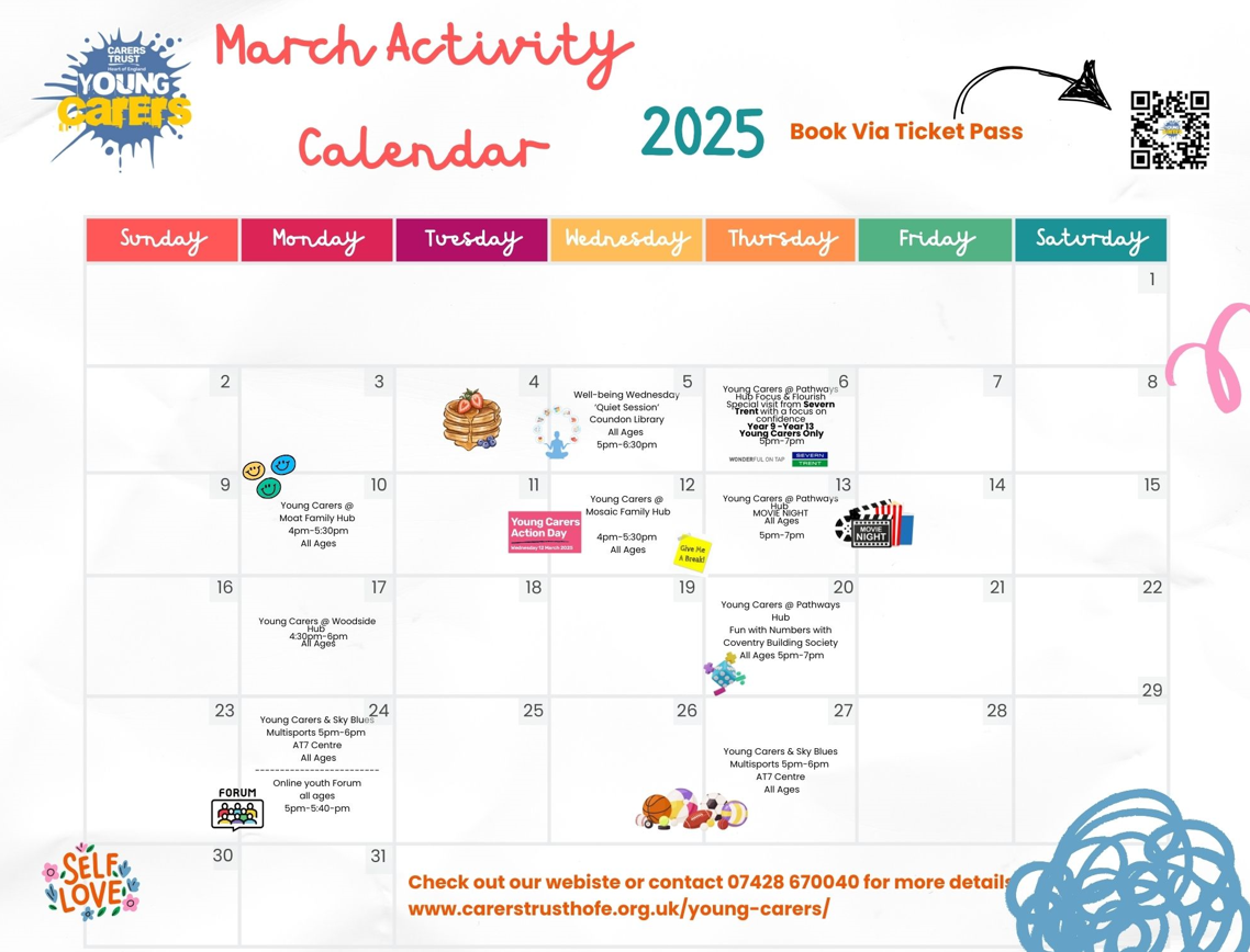 - Thursday 6 March – Pathways Hub Visit from Severn Trent – focus on confidence - (Young Carers only) (5pm – 7pm)