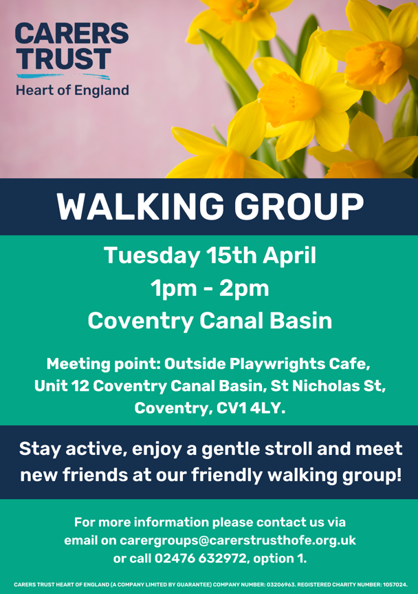 Carers' Trust Heart of England are inviting you to attend their walking group being held on Tuesday 15 April from 1pm - 2pm at Coventry Canal Basin.