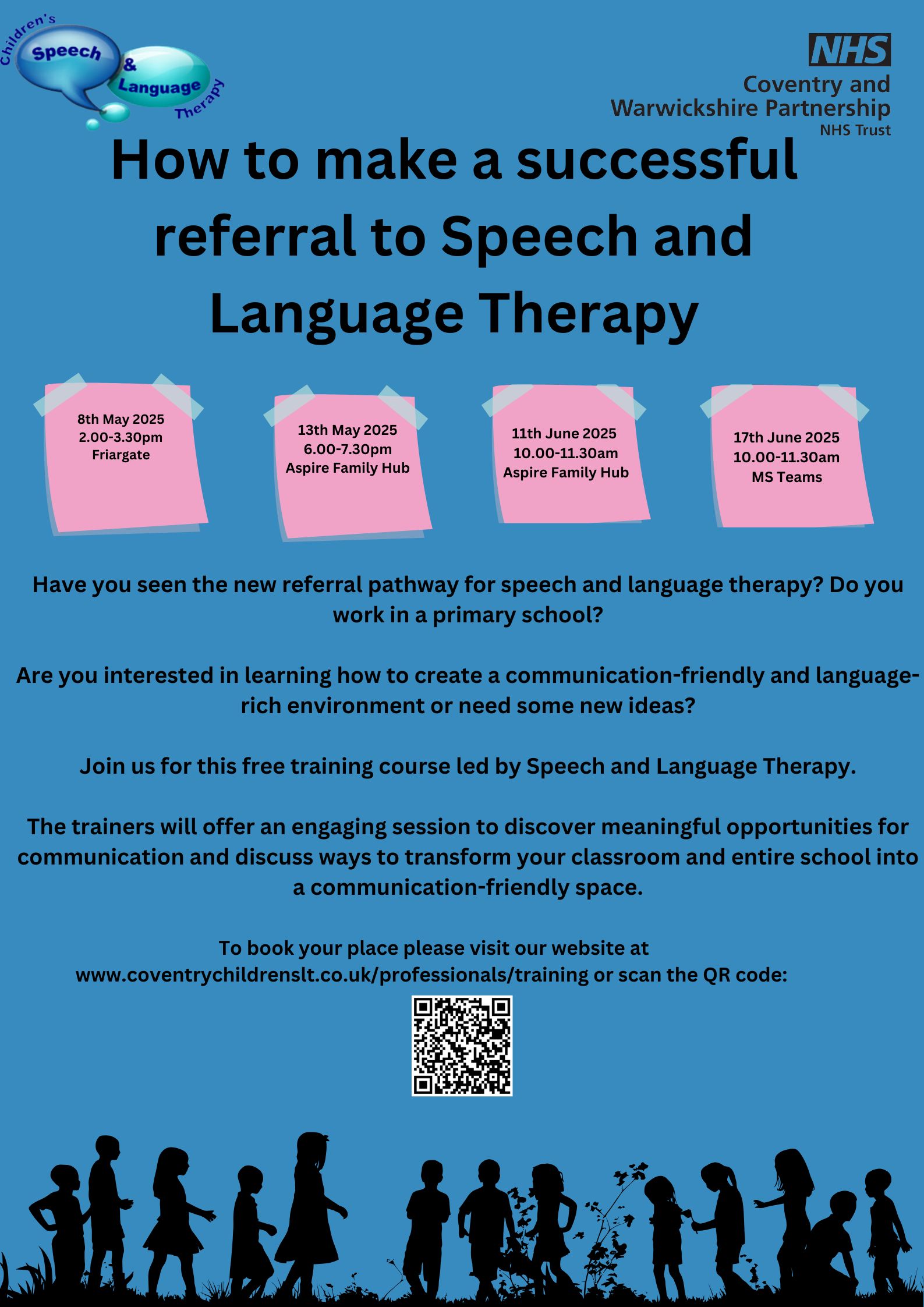 NHS: Speech and Language Therapy - how to make a referral, creating a communication friendly and language rich environment. This training is available on four dates in May and June.