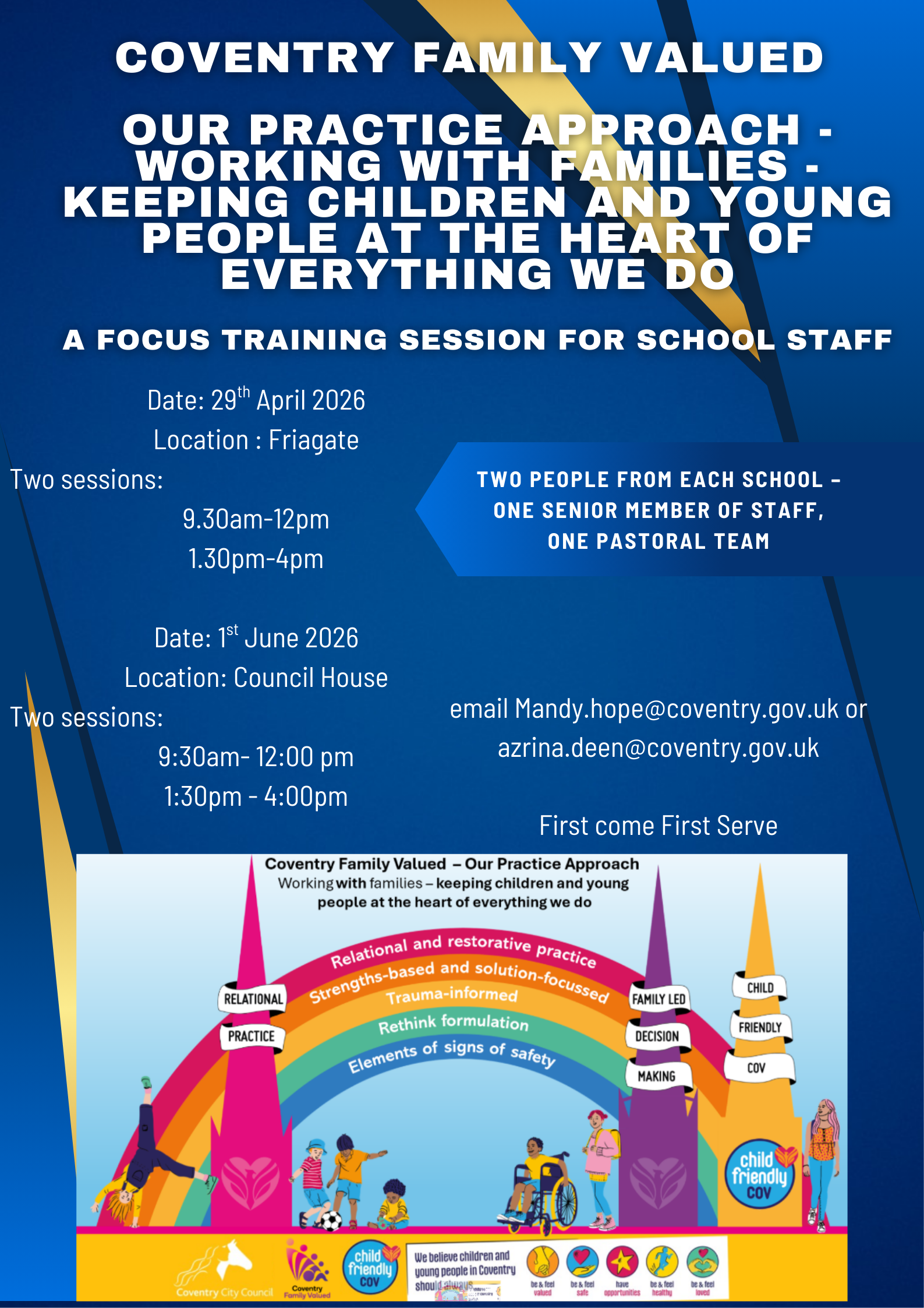 - Understanding the rise of ketamine webinar - 3 June, 2pm to 3:30pm. This free webinar has been created to inform practitioners working with children and families around the rise of ketamine use in young people and how to access support. Please email cscptraining@coventry.gov.uk to book your place.