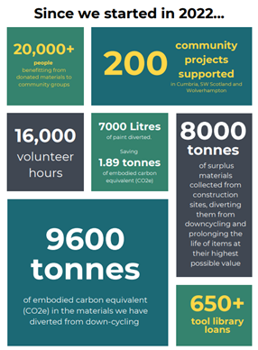 The Rebuild Site CIC has just released its 2024 Impact Report, highlighting a record-breaking year. Over 8,000 tonnes of surplus construction materials have been diverted from going to waste so far—saving 9,600 tonnes of embodied carbon and supporting more than 20,000 people through providing free materials to community projects and workshops.
