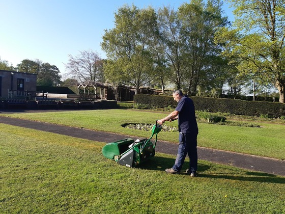 Image is of Cumberland Council staff member using the new battery-powered cylinder mowers at Carlisle Crematorium