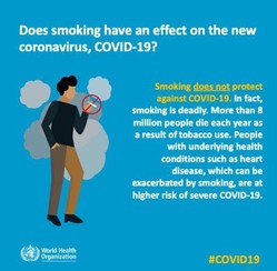 - A review of studies by public health experts convened by WHO on 29 April 2020 found that smokers are more likely to develop severe disease with COVID-19, compared to non-smokers.