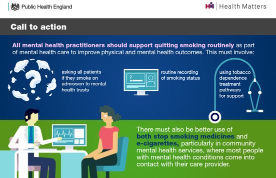 - All mental health practitioners should routinely support quitting smoking, including asking patients if they smoke, recording this data and using tobacco dependence treatment pathways (e.g. referring to stop smoking services).