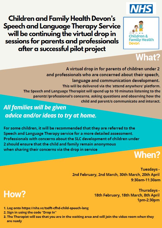Click here for the poster which contains nformation on the additional virtual drop in sessions for parents of children under 2 and professionals who are concerned about children speech, language and commination development.