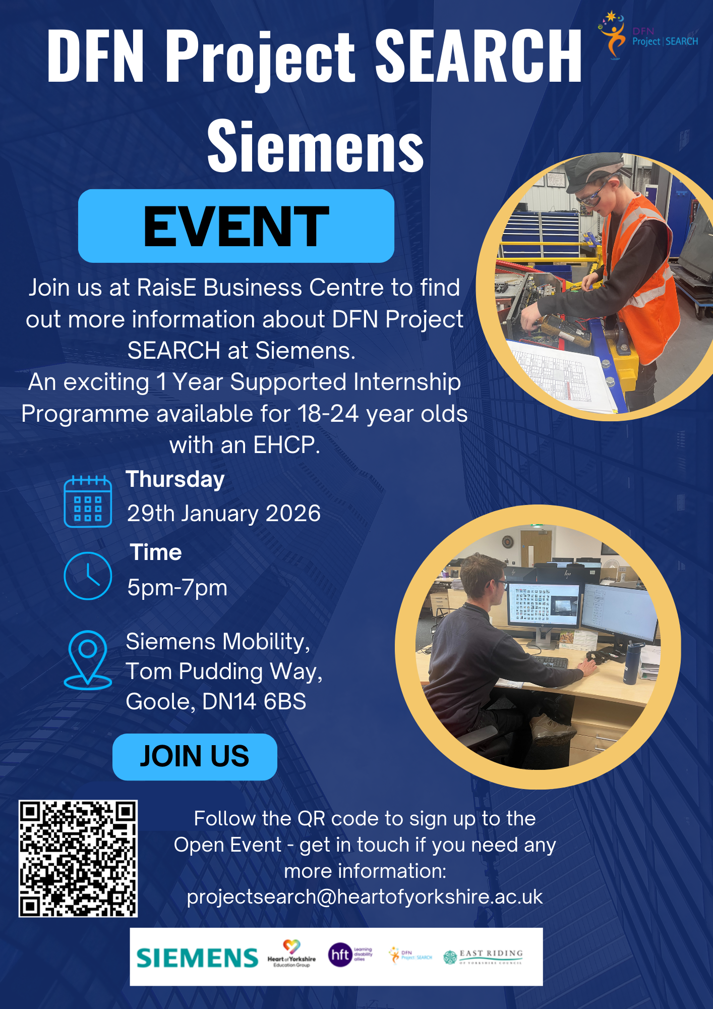 Join us to learn more about DFN Project SEARCH at Siemens: 📍 RaisE Business Centre, Goole 📅 Thursday 29 January 2026 🕔 5pm–7pm