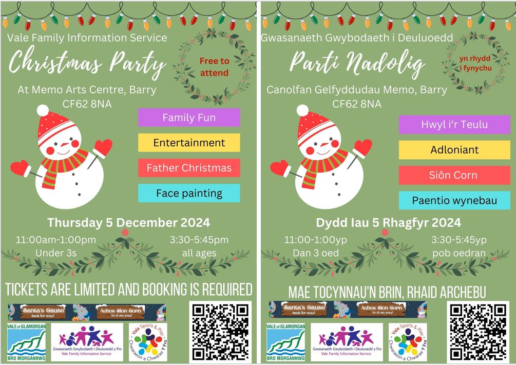 Dilynwch ni ar Facebook os nad ydych yn barod gan ein bod yn postio 'beth sy’ mlaen' yn y Fro bob dydd a byddwn yn gwneud hyn drwy gydol cyfnod yr ŵyl hon. Rydym yn cynnal dau barti Nadolig ddydd Iau 5 Rhagfyr yng Nghanolfan Gelfyddydau Memo y Barri. Mae parti un ar gyfer plant cyn-ysgol o dan 3 oed yn unig a gellir prynu tocynnau yma Mae Parti dau ar gyfer plant o bob oed. Mae pob tocyn wedi’i werthu eisoes ond gallwch ddewis ymuno â'n rhestr aros yma Bydd y digwyddiad yn rhad ac am ddim i fynd iddo, ond bydd costau yn gysylltiedig â'r lluniaeth a gaiff ei gwerthu. Rydym hefyd yn cefnogi Achos Siôn Corn eto eleni a fydd yn codi arian trwy gynnig Paentio Wynebau (argymhellir i blant 3+ oed), gwerthu tocynnau raffl a chynnig amrywiaeth o gemau eraill i'r teulu cyfan gymryd rhan ynddynt. Dewch ag arian parod i gefnogi'r achos. Rhaid cael tocyn i’r digwyddiad hwn, a rhaid cael pob tocyn drwy TicketSource. Ni allwn dderbyn archebion tocynnau dros y ffôn / e-bost. I deuluoedd sy'n byw yn y Fro yn unig mae'r digwyddiad hwn. Cliciwch yma i lawrlwytho poster ein partïon Manylion Cyswllt: 01446 704704 ![]() Cliciwch yma i lawrlwytho poster ein partïon