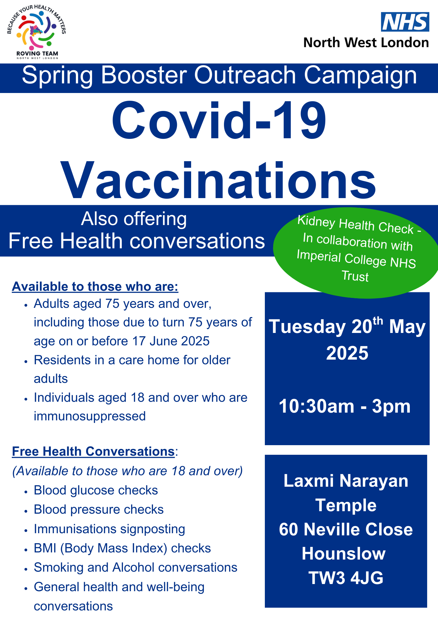 The NHS North West London Roving Team is holding a health outreach event at the Laxmi Narayan Temple, TW3 4JG on Tuesday, 20 May.