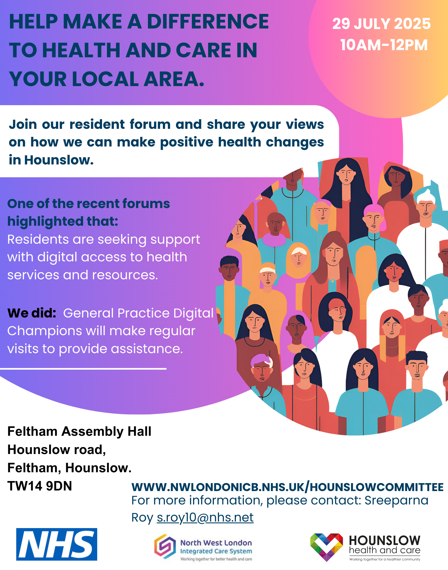 Do you have ideas on how Hounslow health and care services can be improved? If so, join a residents forum meeting from 10am to 12pm on Tuesday, 29 July at Feltham Assembly Hall and have your say.