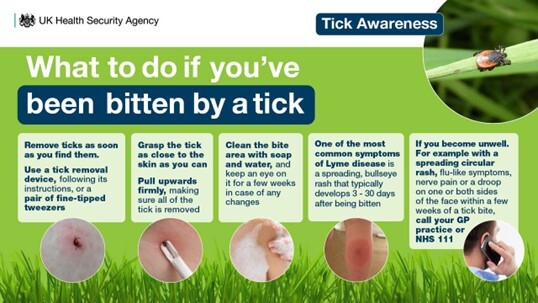 But when spending the day in grassy or wooded areas please be tick aware. Ticks can carry diseases. Always check for ticks when you return from a day out and remember to check your pets too! For more information to share with your pupils and parents, visit the UKHSA’s tick surveillance programme.