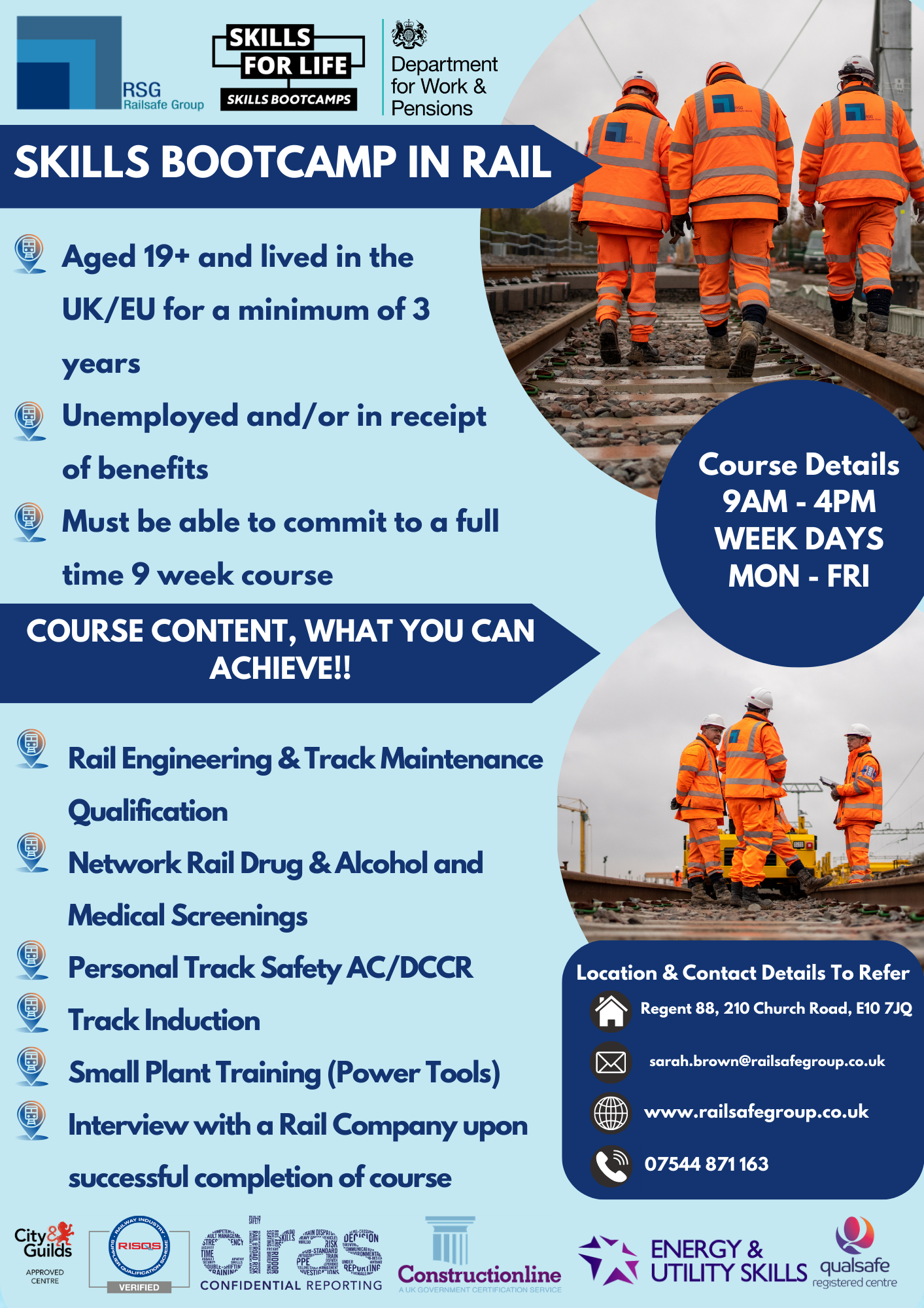 Anyone over the age of 19 who is unemployed and lives inside a London Borough for Level 2 NVQ in Rail Engineering Track Maintenance.