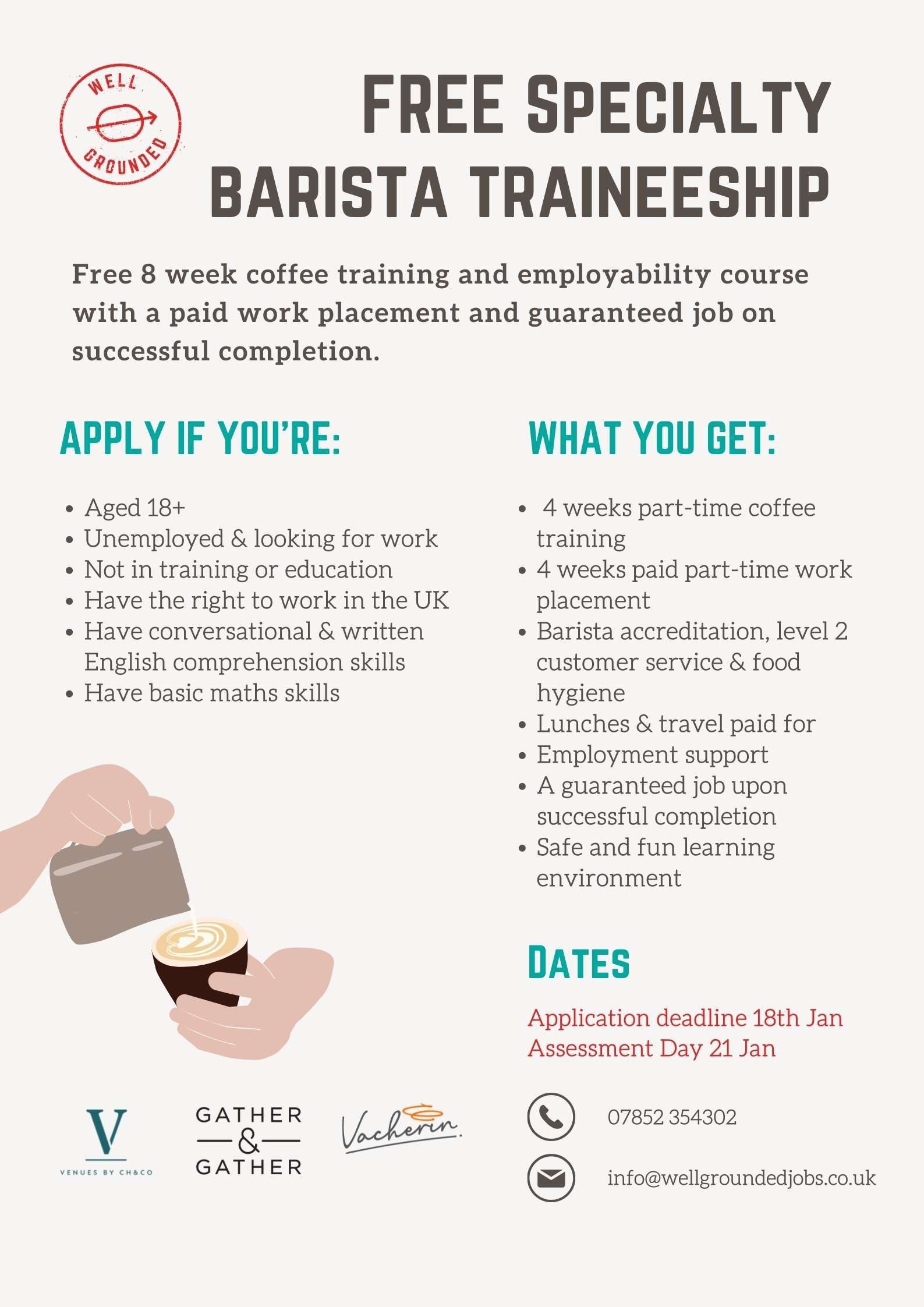 Well Grounded is now taking applications for its February course. This free 8 week coffee and employability training course is for aspiring baristas and includes a paid work experience placement and guaranteed job on completion.
