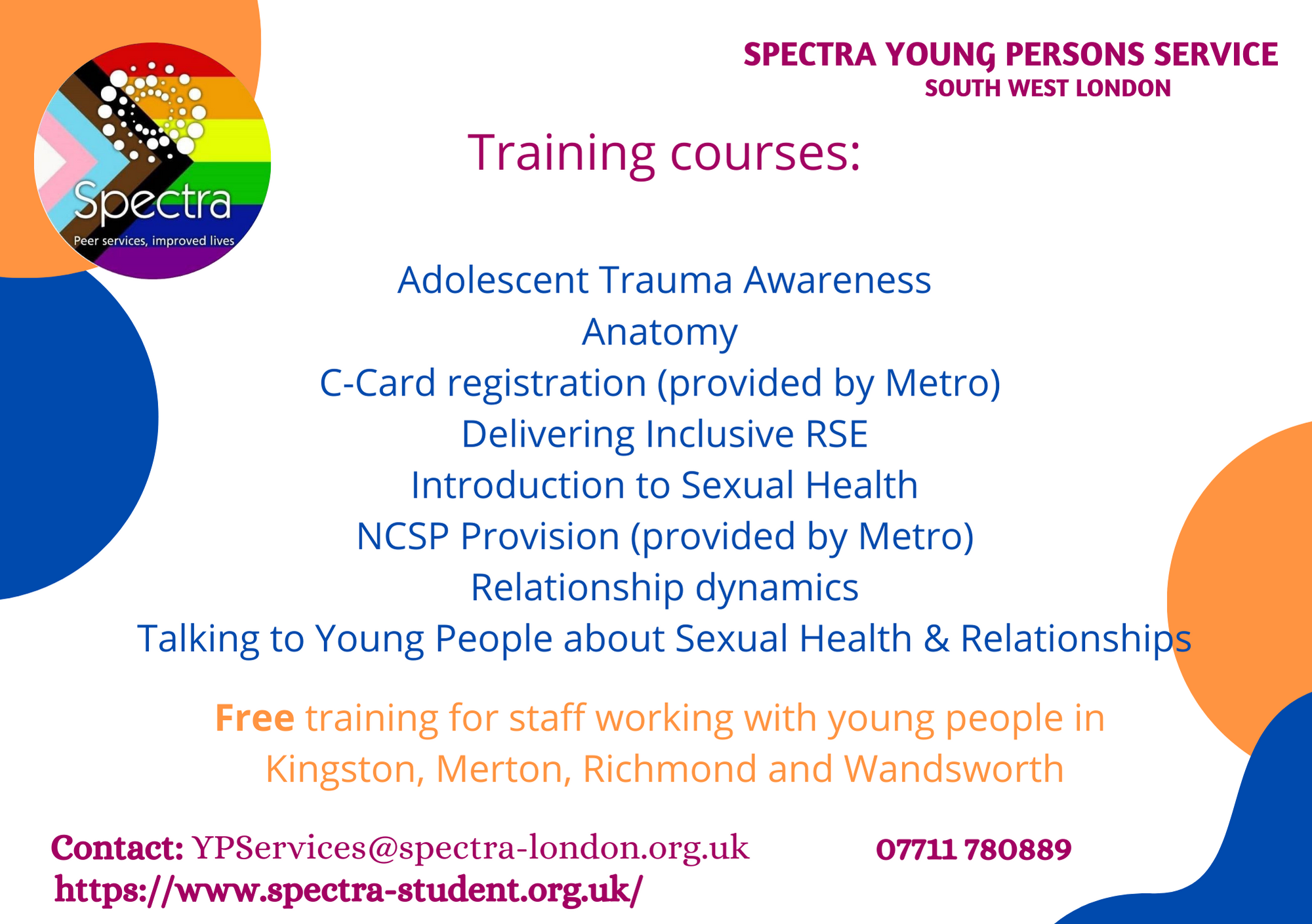 Spectra Young Persons Service are offering our Voluntary Sector partners a series of sexual health professional training courses for staff working with young people in Richmond. Courses include relationship dynamics, anatomy and C-Card registration. To find out more or for details of how to book your place see the Spectra training courses flyer.