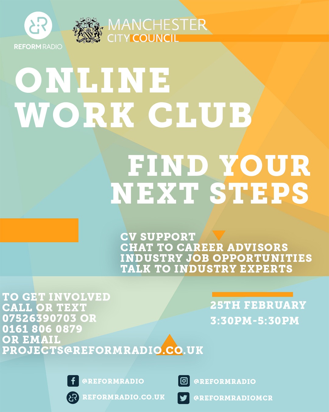 Reform Radio Online Work Club (flyer) Thursday 25 February 3.30pm to 5.30pm Work Club runs on the last Thursday of every month with a full session based on opportunities for the future. It includes a number of speakers who discuss various opportunities available, as well as 1-1s, and pastoral sessions are also available.