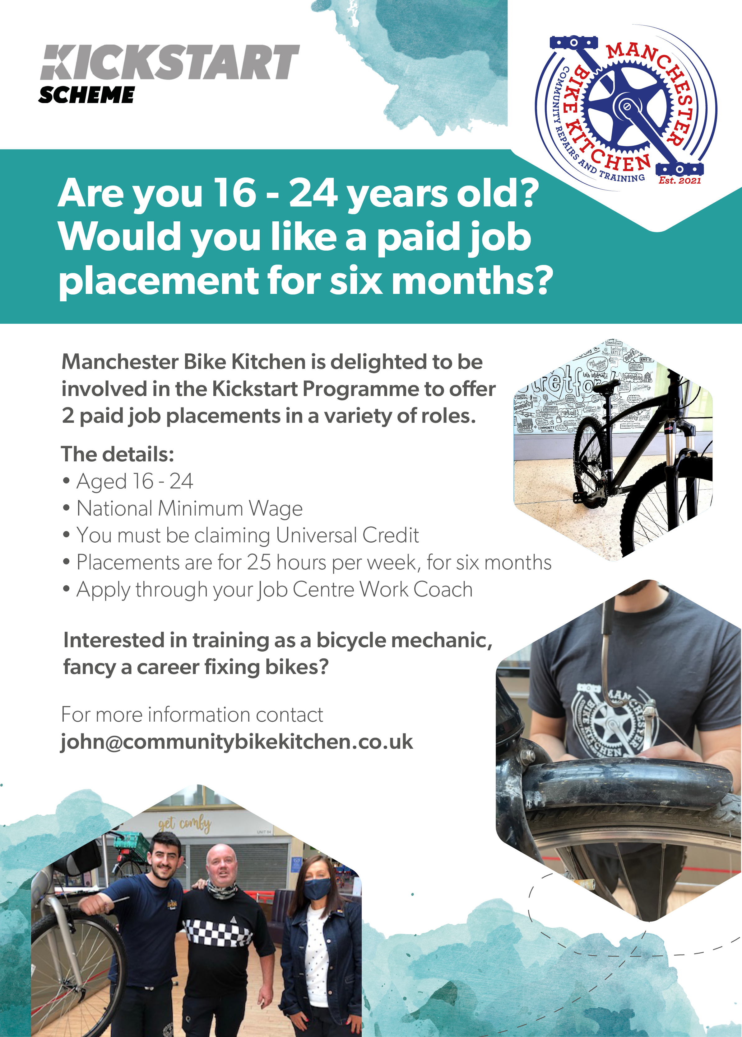Manchester Bike Kitchen Interested training as a bike mechanic, fancy a career fixing bikes? Paid Job Placement 6 months Age 16 to 24 and claiming Universal Credit If you want to find out more about the role contact john@communitybikekitchen.co.uk Apply through your Job Centre Work Coach