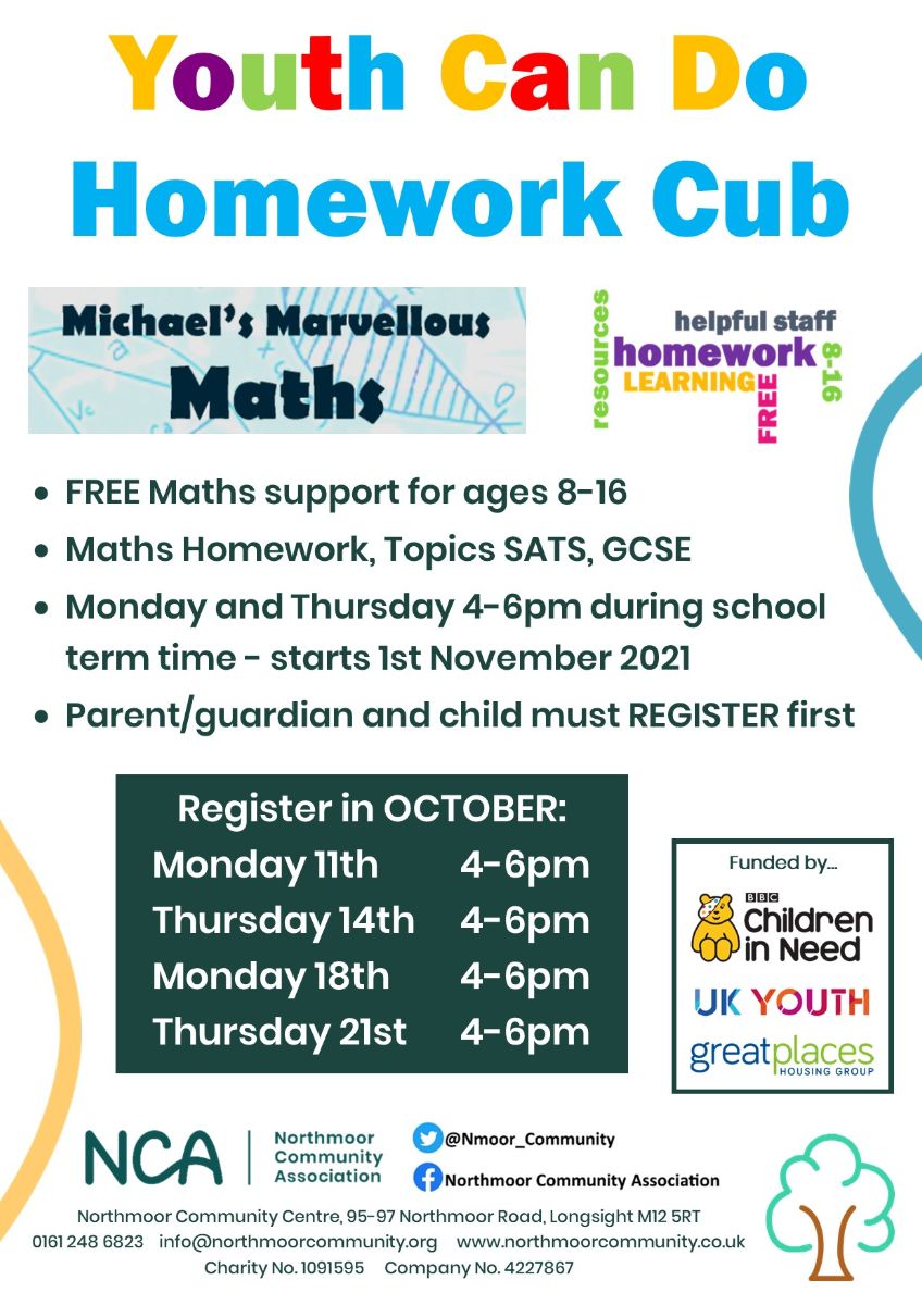 Youth Can Do Homework Club is back! Parent/guardian and children can register for Michael's Marvellous Maths: 4pm to 6pm In October 11, 14, 18, 21