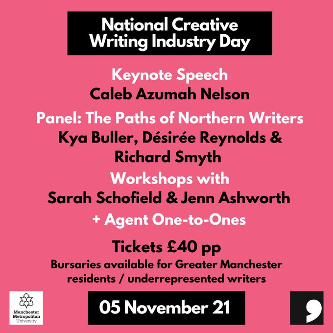 Comma Press, in partnership with The Writing School at Manchester Metropolitan University, invite you to their: National Creative Writing Industry Day - 5 November Taking place at Manchester Met on the 5 November, this conference is committed to providing participants with a unique introduction to the publishing industry and its professionals. The day will run from 9.30am to 5pm on Friday 5 November, and this conference will offer a keynote speech from a prominent author, a panel discussion, 1 x one-to-one session with an agent per attendee, and a choice of two workshops.