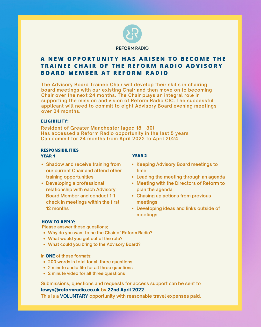 Advisory Board Trainee Chairperson Reform Radio are on the look-out for a new Advisory Board Trainee Chairperson. Have you ever thought about volunteering with the Reform team to help support & guide the future of their platform, use your voice & make a difference!