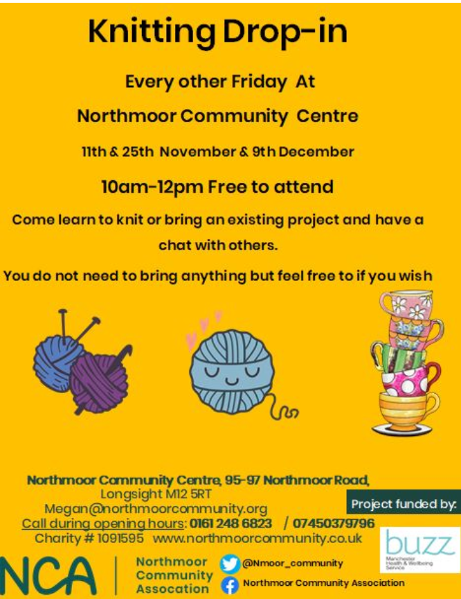 NCA Drop In Knitting group 9 December, 10am 12pm Free to attend Come learn to knit or bring an existing project and have a chat with others. You do not need to bring anything but feel free to if you wish