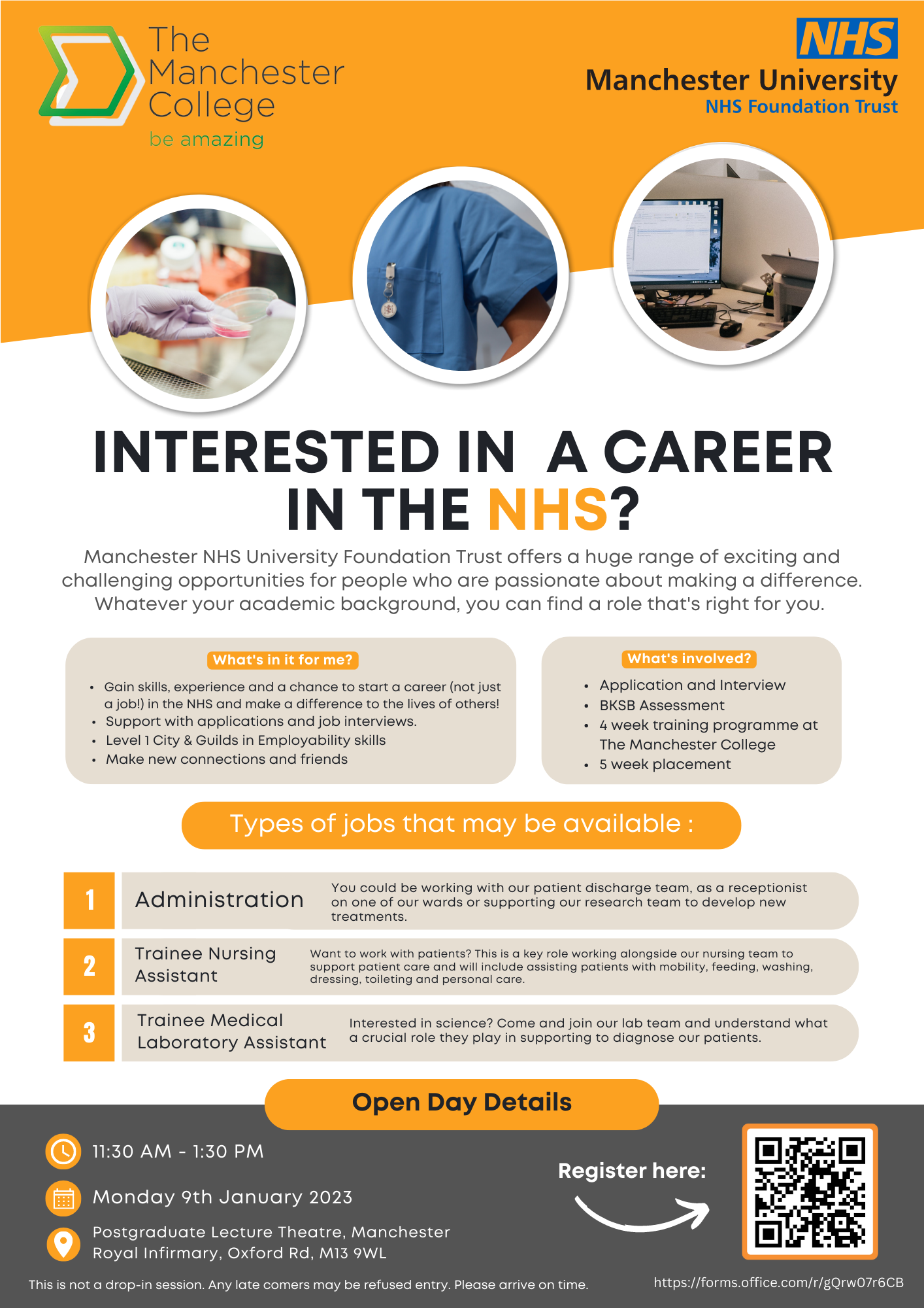 Manchester University NHS Foundation Trust Open Day Monday 9 January 11.30am to 1.30pm Interested in a career in the NHS? Manchester University NHS Foundation Trust offers a huge range of opportunities for people who are passionate about making a difference. Whatever your academic background, you can find a role that's right for you.