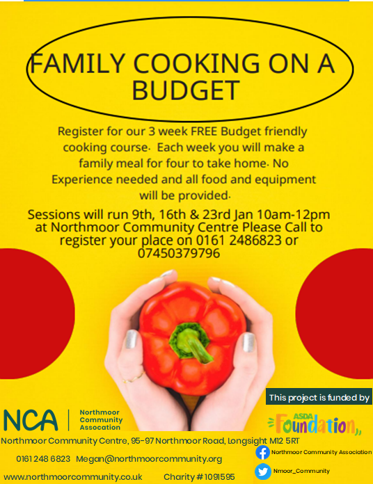 Family Cooking on a Budget Sessions will run 9, 16 and 23 January Register for their 3 week free budget friendly cooking course. Each week you will make a family meal for four to take home. No experience needed and all food and equipment will be provided. Please call 0161 248 6823/ 07450379796 to book your place.