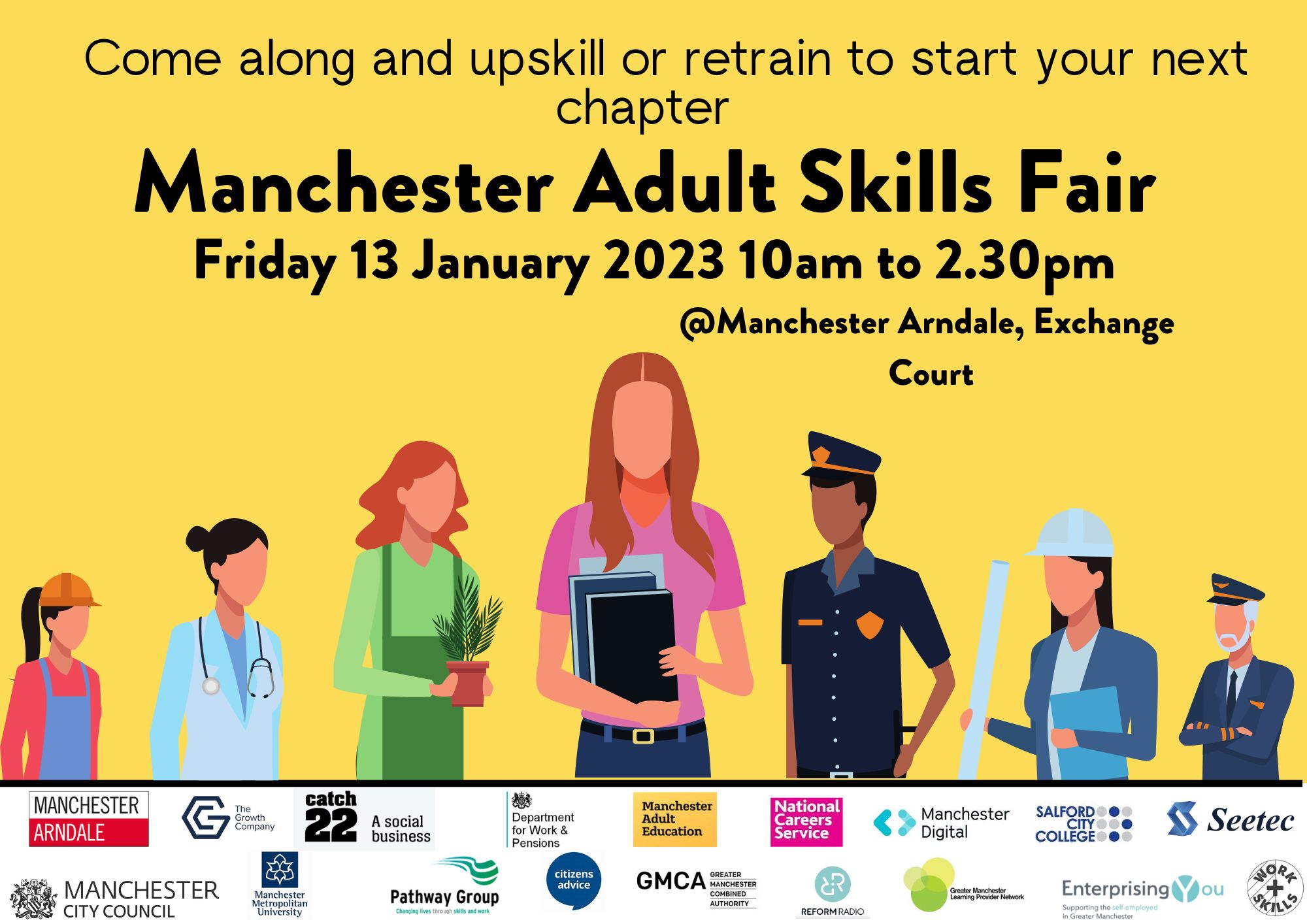 Manchester Adult Skills Fair Event date: 13 January The aim of this event is to support Manchester residents 19+ that are unemployed or want to upskill/retrain to understand what is available to them. There will be around 20 training providers from multiple sectors there on the day, hosting activities to inspire residents on the careers/pathways available to them.