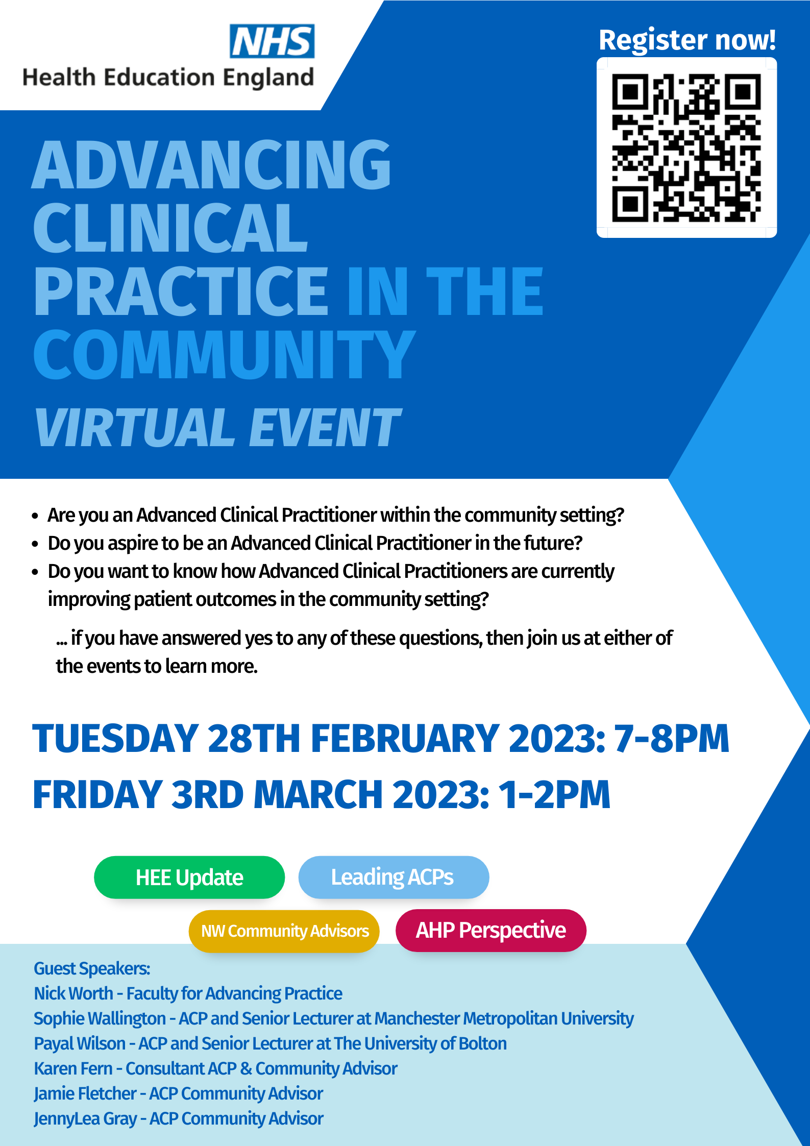 Advancing clinical practice in the community by Health Education England - Tuesday 28 February from 7:00pm. Suitable for advanced clinical practitioners – see this poster [PNG, 444KB] for details